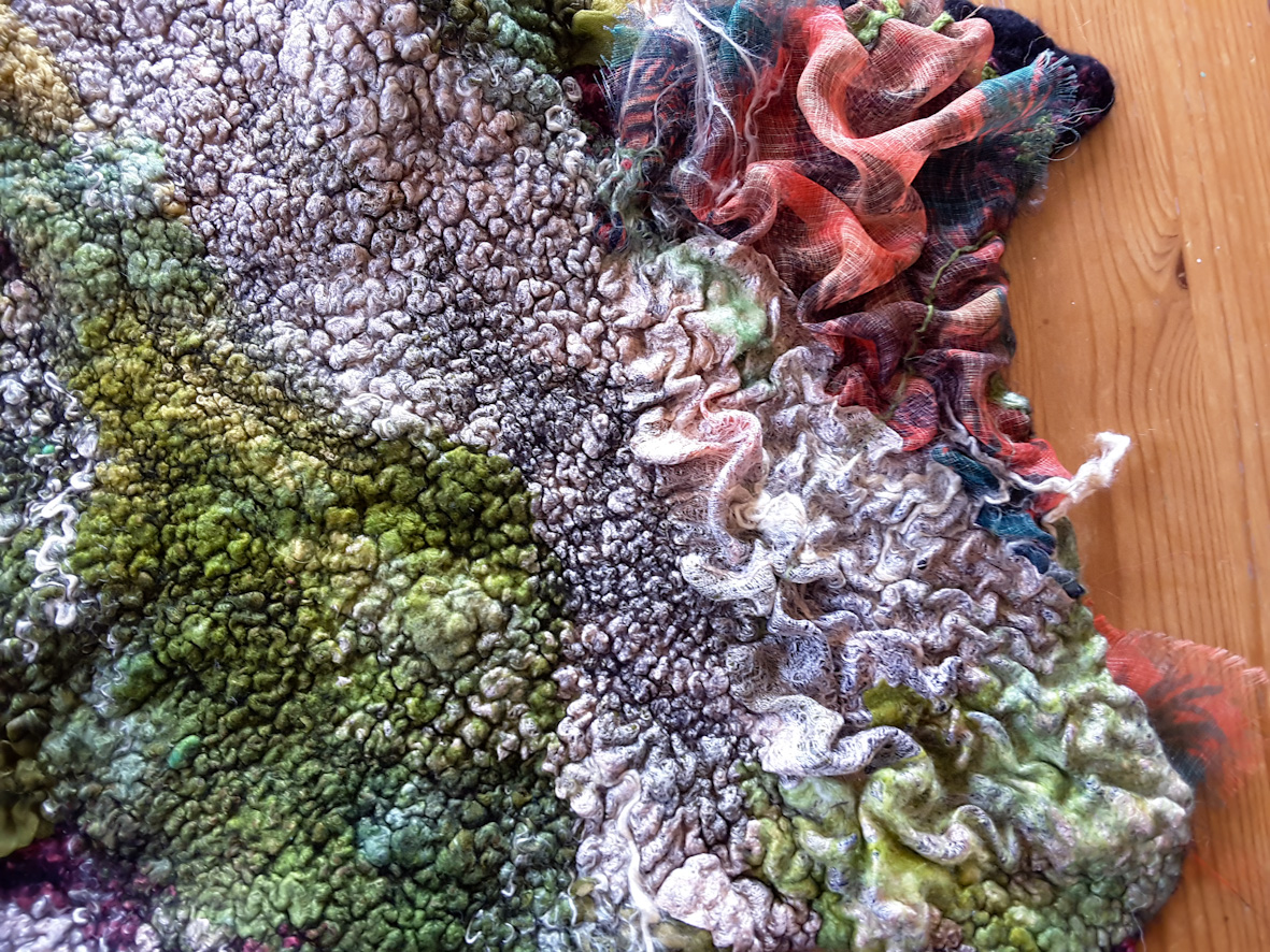 4. This is the most interesting detail: at the top right corner there is a piece of rather dense polyester which hardly felted at all (reddish), but part of it was covered with margelan silk (beige) and this "sandwich" felted well. The large "ridge" is polyester covered with margelan silk.
